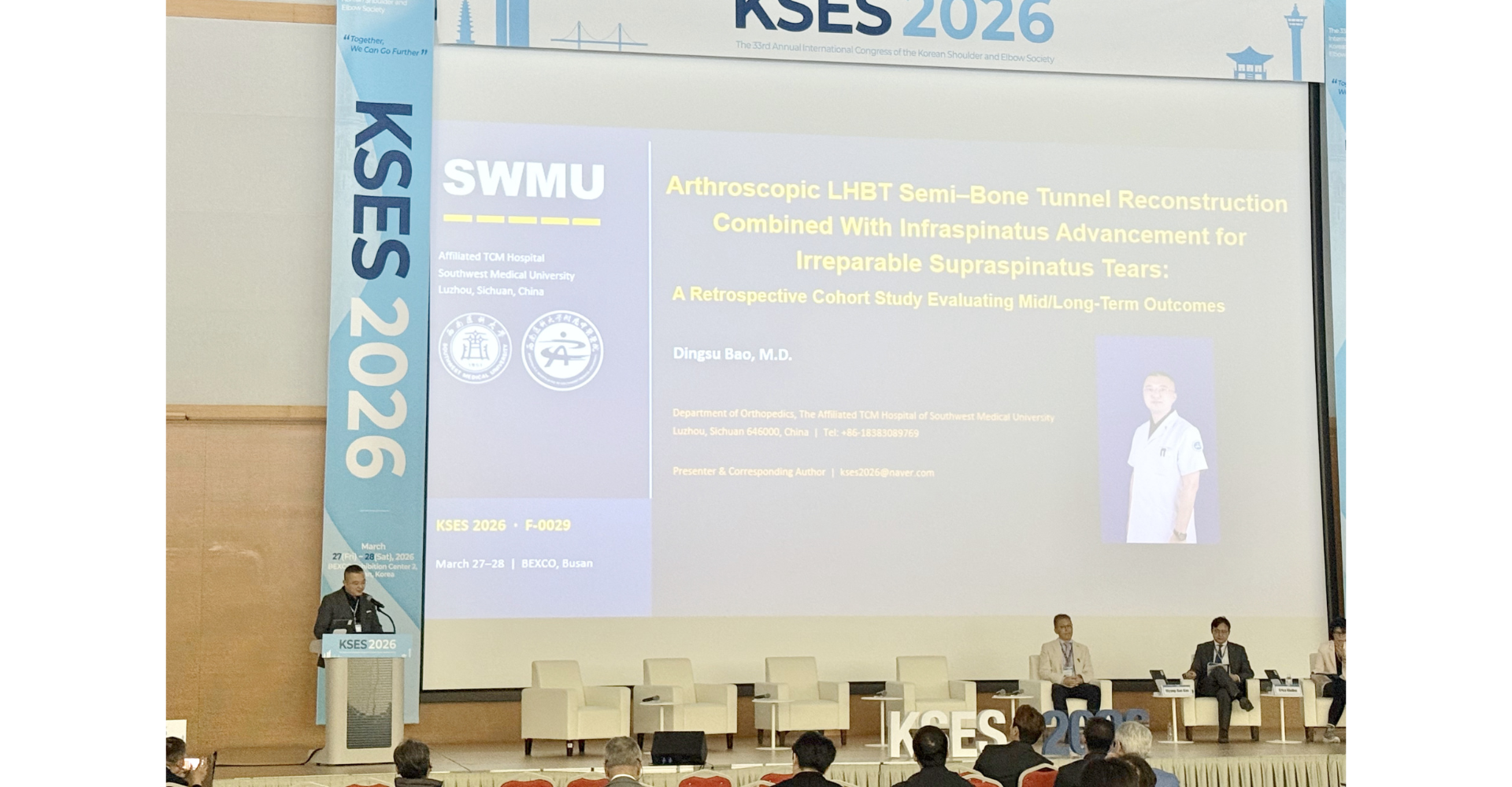 3月27-28日,KSES 2026——第33届韩国肩肘外科国际大会(The 33rd Annual International Congress of the Korean Shoulder and Elbow Society)在韩国釜山举行,来自中国、美国、欧洲、泰国、印度等多个国家和地区的肩肘外科医师参加了会议,附属中医医院骨伤科关节·足踝组副主任暴丁溯副教授受主办方韩国肩肘外科协会主席Hyun-Seok Song教授的邀请参会。