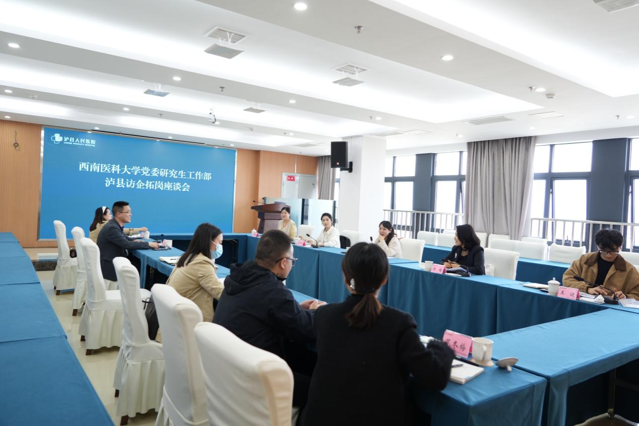 为进一步深化校院合作,精准对接医学人才供需,搭建研究生培养与就业桥梁,4月8日下午学校党委研究生工作部副部长陈刘流带队,研究生工作部学生科科长余媛,临床医学院、中西医结合学院、药学院等学院具体负责就业工作辅导员一行5人,赴泸县人民医院开展访企拓岗座谈。会议由泸县人民医院党委副书记韦仁健主持,泸县人民医院党委副书记、院长李孝刚 ,泸县中医医院副院长曾晓南及医院人事部、宣传科负责人参加座谈。