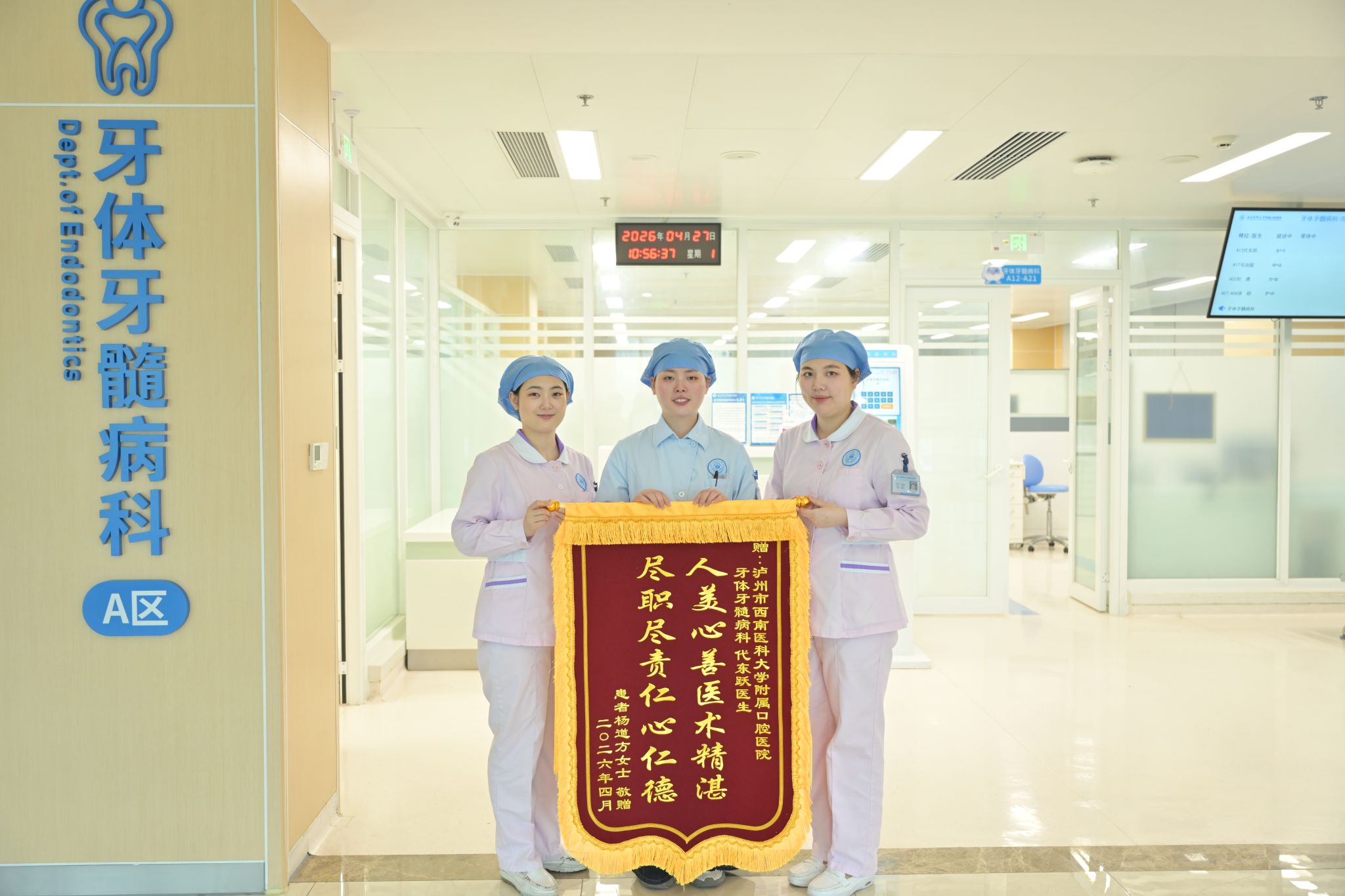 近日,牙体牙髓病科收到一份格外暖心的快递,一面印着“人美心善医术精湛、尽职尽责仁心仁德”的鲜红锦旗,辗转送到了代东跃医生手中。这份特殊的致谢,来自一位经代医生精心治疗后痊愈的婆婆。因老人行动不便,便特意委托孙女邮寄锦旗,以此抒发心中最诚挚的感激。