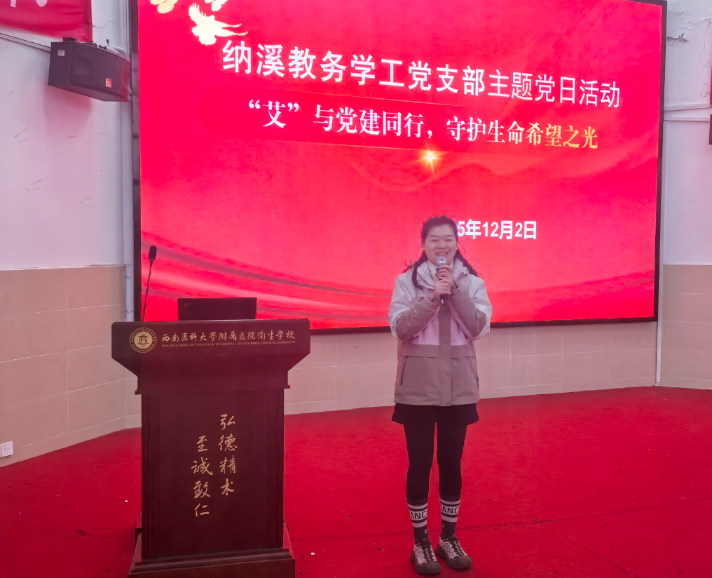 12月2日,护理学院·附属医院卫校纳溪校区教务学工党支部联合综合护理与研究中心党支部、后勤保卫党支部、忠山校区党支部,开展“防艾于未然”专题知识讲座。综合护理与研究中心党支部简丽萍老师主讲,校区师生代表现场聆听学习。