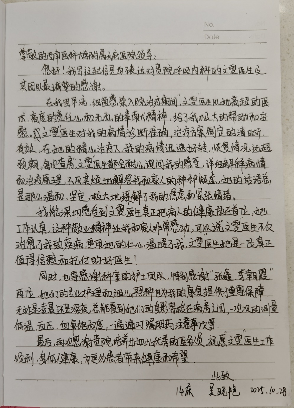 近期,附属天府医院呼吸内科医护团队接连收到多封手写信件,字里行间满含真情,既见证了医护人员的暖心守护与医者担当,更定格了医患同心共抗顽疾的动人情谊。