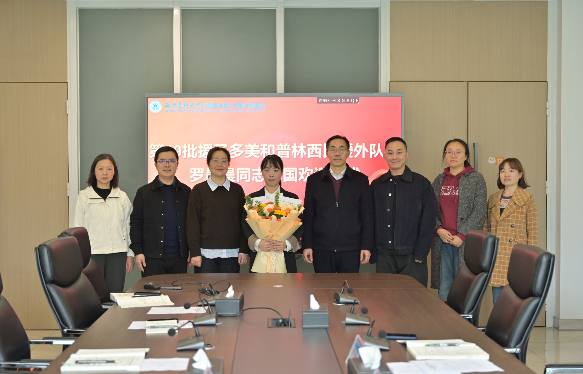 3月27日下午,附属口腔医院于行政楼401会议室隆重举行欢迎仪式,迎接第19批援圣多美和普林西比医疗队队员罗晨晨——她圆满完成18个月援外医疗任务,载誉平安归国。仪式由副院长郭玲主持,医院党委副书记、院长肖金刚及各相关部门负责人出席。