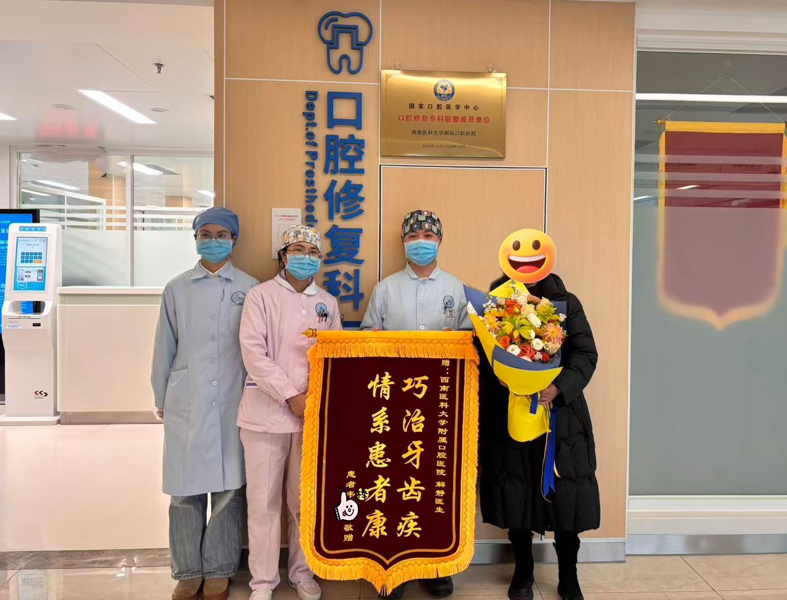 近日,口腔修复科候诊区里,一面鲜红的锦旗格外引人注目。“巧治牙齿疾,情系患者康”十个大字,字字凝聚着患者韦先生对修复科解静医生的真挚谢意,也定格下医患之间的温暖瞬间。